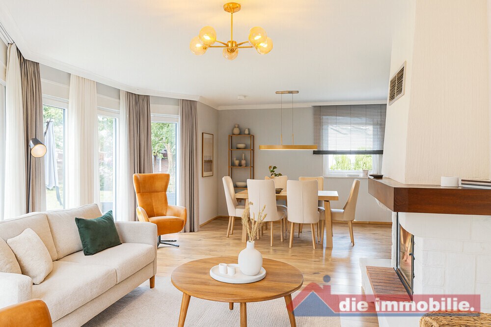 Bereits beim Betreten empfängt Sie ein großzügiger Eingangsbereich, von dem aus Sie Zugang zum Gäste-Bad sowie zum Hauswirtschaftsraum haben. Die helle Küche mit direktem Zugang zur Terrasse lädt zum gemeinsamen Kochen und Genießen ein. Der offene, lichtdurchflutete Wohnbereich mit Kamin schafft eine behagliche Atmosphäre und führt Sie direkt in den liebevoll angelegten Garten – perfekt, um entspannte Stunden mit Familie und Freunden zu verbringen.