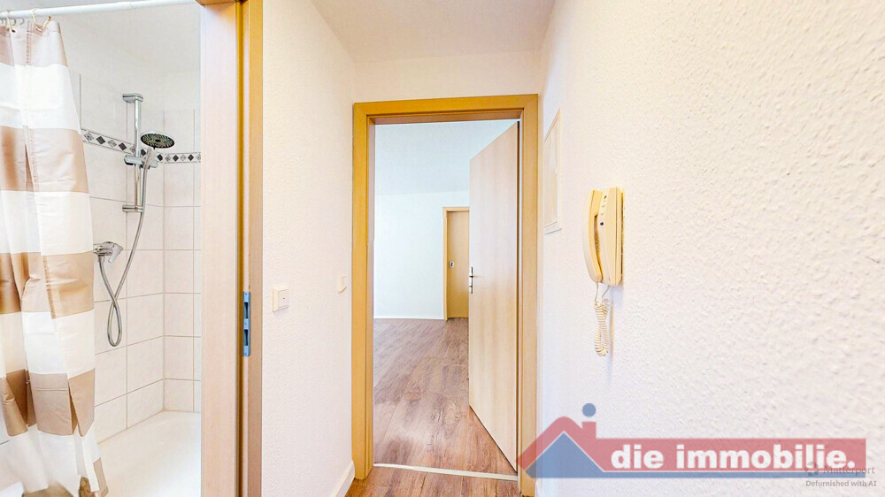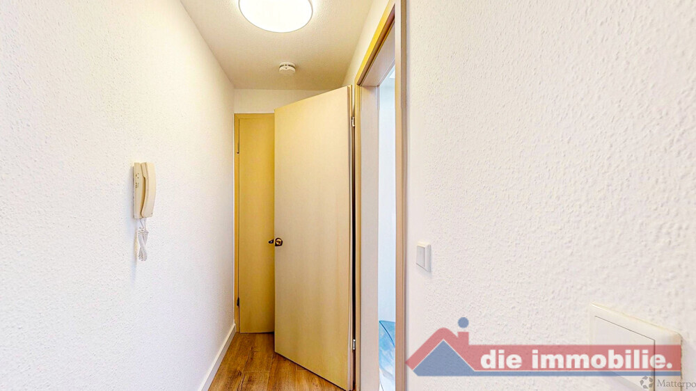 Vom Flur aus gelangen Sie in das Badezimmer mit Dusche und Dachfenster sowie in den hellen Wohnbereich mit integrierter Küche und Waschmaschinenanschluss. Von hier aus haben Sie Zugang zum Balkon mit ruhiger Ausrichtung zum Innenhof. Das Schlafzimmer ist ebenfalls über den Wohnbereich erreichbar und bietet einen angenehmen Rückzugsort.