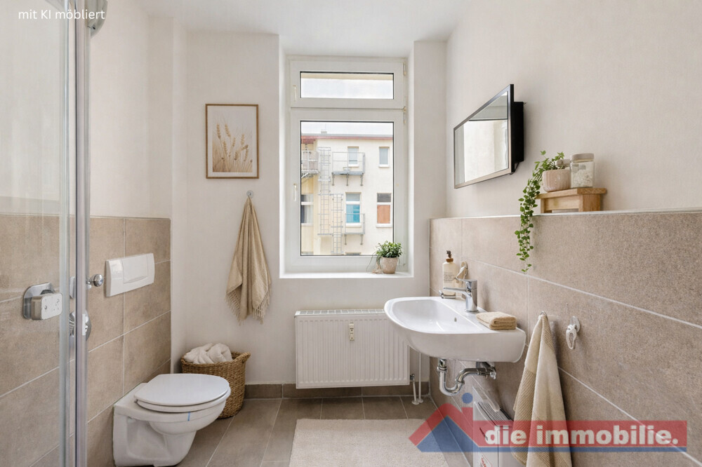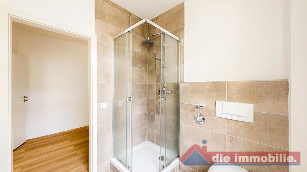 Über das Wohnzimmer erreichen Sie das Schlafzimmer. Von dort gelangen Sie in das modern geflieste Badezimmer mit Dusche und Fenster.