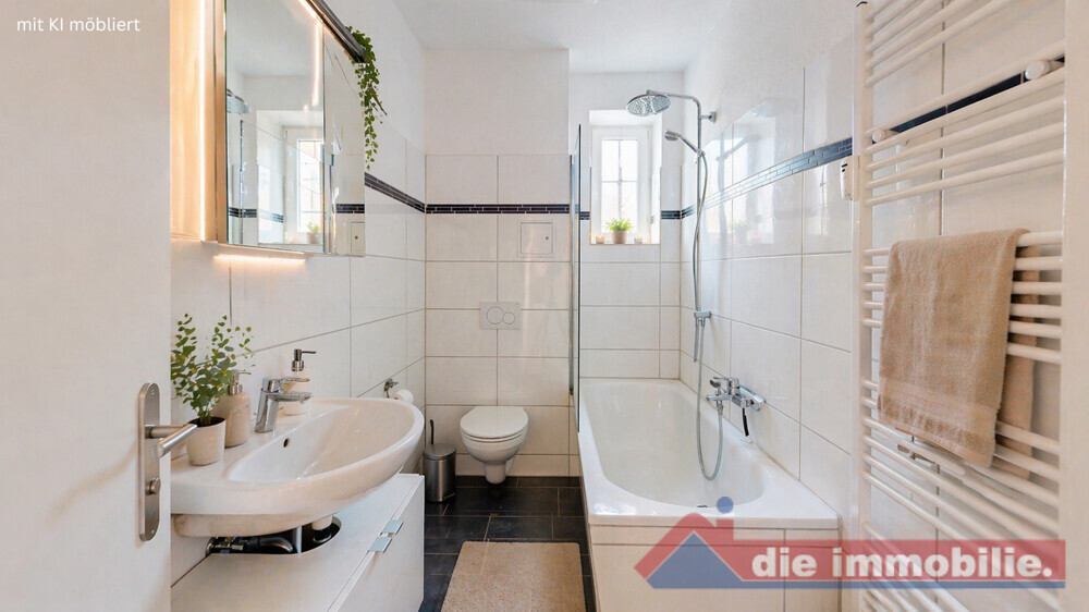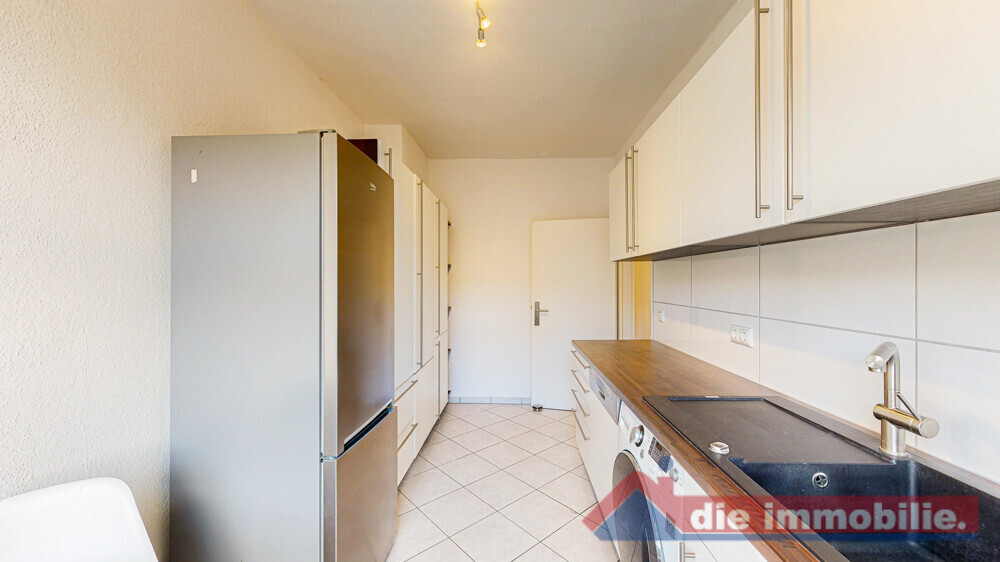 Das Badezimmer bietet eine Badewannen-Duschkombination und ein Fenster für natürliche Belüftung. Die Küche ist mit einer gepflegten Einbauküche ausgestattet und bietet Platz für einen kleinen Essbereich.