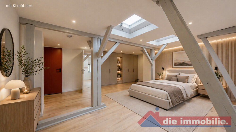 Diese charmante 5-Zimmer-Dachgeschosswohnung mit ca. 114 m² überzeugt durch viel Licht, sichtbare Holzbalken und eine angenehme Raumaufteilung. Der Flur teilt sich in zwei Bereiche: Einer führt zu einem Schlafzimmer sowie einem zusätzlichen Raum, der sich ideal als begehbarer Kleiderschrank oder kleiner Rückzugsort eignet. Beide Zimmer zeigen den gemütlichen Dachgeschosscharakter mit sichtbaren Balken.